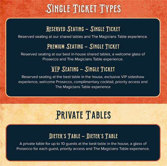 Step into the private performance space and warehouse of Dieter Roterburg, famed carnival owner and magician for a night of magic, drinking, music and mystery… it’s a night you’ll never forget.